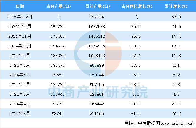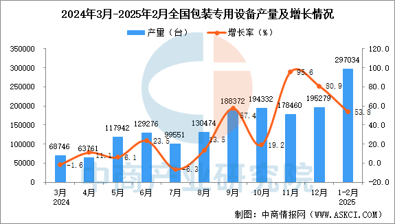 2025年1-2月全国包拆公用设备当月产量取客岁同期比拟增加。2025年1-2月全国包拆公用设备产量为297034台(29.7万台),同比增加53.8%。中商谍报网讯:据中商财产研究院数据库,同时中商财产研究院还供给财产大数据、财产谍报、行业研究演讲、行业、可行性研究演讲、财产规划、财产链招商图谱、财产招商、“十五五”规划等征询办事。更多材料请参考中商财产研究院发布的《中国包拆公用设备行业市场前景及投资机遇研究演讲》,